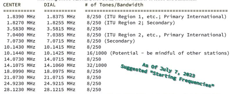The table below indicates recommended calling frequencies for Olivia operation.  Note however, that other digital modes mentioned in this discussion will frequently be found on or around the same frequencies, so a good eye on the waterfall and a good ear (each mode has its own distinctive sound) will be needed to distinguish between them.